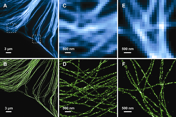 C (conventional immunofluoresence), D (STORM): Comparison of two color conventional and STORM images of microtubules (green) and clathrin-coated pits (red) in cells.