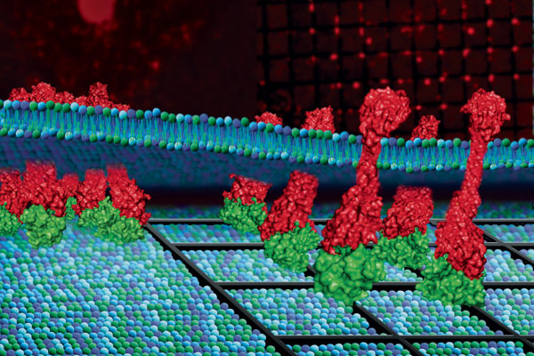 They divided EphA2 into their gridded membrane before introducing a cell displaying ephrin-A1 proteins. Though the EphA2 could bind to ephrin-A1, the proteins couldn't cluster and the cell no longer rearranged its cytoskeleton. The results appeared in the March 12, 2010, issue of Science. Next, Groves wants to see small-molecule drugs tested on the system to learn what compounds mimic this disruption of EphA2 movement. Stopping the protein from forming clusters may block its cancer-causing ability, he says.