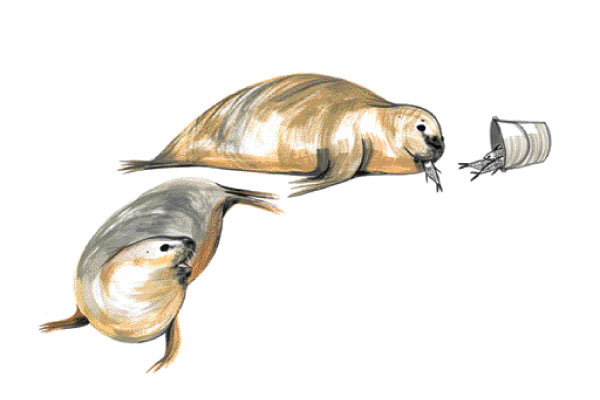 Brejc and hundreds of other volunteers provide the abandoned pups with food and warmth. "When the harbor seal pups first come in—they are about a meter long—we feed them a fatty mixture of salmon oil and powdered milk through a tube," Brejc says. As the animals put on weight, they get solid food, fish. Volunteers teach the animals to eat fish by putting it directly in their mouths, a task that takes two volunteers: one to hold the animal and another to feed it. Eventually, the seals learn to catch fish on their own. "By the end of the season, we dump seven kilograms of fish in their pen and walk away," says Brejc, who's been working at the center for eight years.