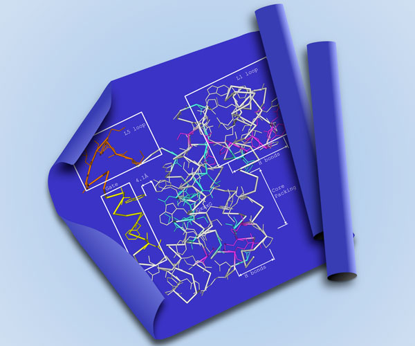 They tested each mutant’s stability with an innovative technique called differential static light scattering. In their experiment, an instrument gradually heated up many rows of enzyme samples at the same time. The rising temperature caused various mutants to break apart at different rates—less stable enzymes unraveled at lower temperatures. The unfolded enzymes scattered light, which a camera detected. The team determined the “breaking points” of the 151 variants and combined the results to create a picture, like an architect’s drawing, of the bonds that support a rhomboid’s three-dimensional structure.