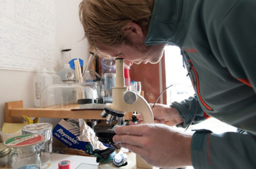 Akerboom dabs the broth onto Petri dishes and watches for the yeast’s trademark shiny white colonies. Then he cultures the colonies to make sure they are yeast (hence the microscope) and watches to see if it actively ferments. He followed this protocol with yeast collected from upstate New York, where his wife’s family lives, and from Janelia’s grassy hillside roof, with dreams of dispensing a “homegrown brew” in the onsite pub.