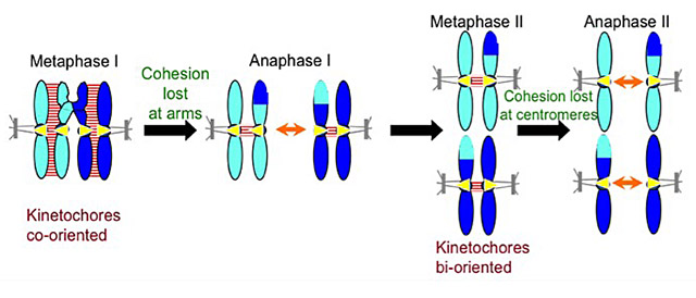 Establishing meiosis, a specialized cell division. Our insights into mitosis spawned our interest in how the molecular mechanisms that govern mitosis are modulated to bring about a specialized division, meiosis. Meiosis consists of two consecutive chromosome segregation phases. During meiosis I, separation of homologous chromosomes occurs; during meiosis II, segregation of sister chromatids takes place. We study how removal of cohesins, the proteins that hold sister chromatids together, is changed during meiosis and how kinetochore-microtubule attachments are modified during meiosis I (Figure 2). In particular, we focus on the regulation of these processes by phosphorylation. We identified two protein kinases, the Polo kinase Cdc5 and cyclin-dependent kinases (CDKs), as key regulators of both events and determined how phosphorylation transforms the mitotic chromosome segregation pattern into the unique meiotic pattern. We hope to further dissect these meiosis-specific specializations and determine the molecular signals that control entry into the germ cell fate.