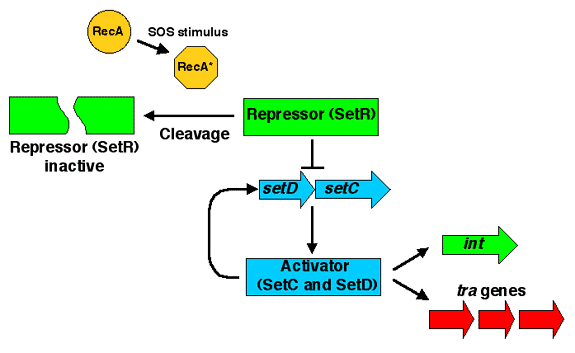 Lateral gene transfer is a major factor in the evolution of pathogenic bacteria because most virulence factors are encoded on mobile genetic elements. Our work is focused on two virulence-linked mobile elements: (1) the integrating filamentous phage CTXφ, which encodes cholera toxin, the principal virulence factor of the cholera-inducing bacterium V. cholerae, and (2) SXT, a V. cholerae–derived integrating conjugative element that encodes multiple antibiotic resistance genes. By studying the interactions of these and other mobile elements with their respective hosts, we have identified environmental and genetic factors that control dissemination of virulence factors. We have also discovered that mobile elements can directly influence pathogenicity (Figures 1 and 2).