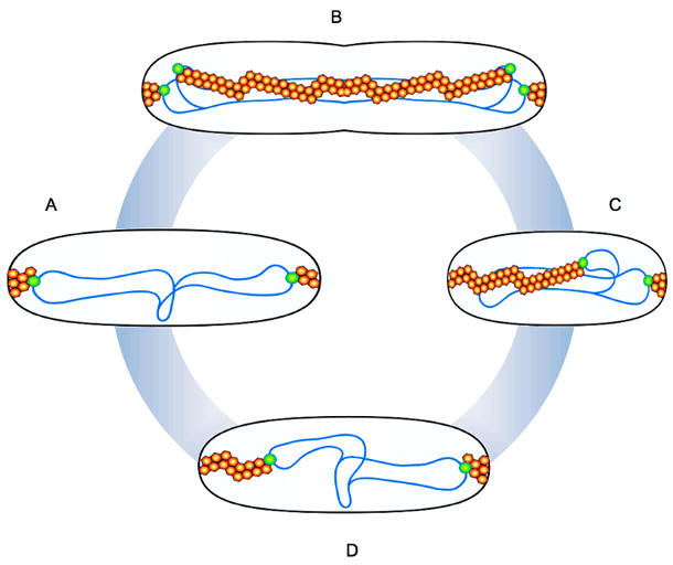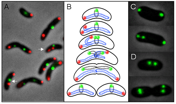 In addition to relying upon distinct mechanisms for replication of each of its two chromosomes, V. cholerae uses distinct processes for segregation of these genetic elements. We used fluorescence microscopy to visualize oriCIvc and oriCIIvc: the two origins were distributed differently at all stages of the cell cycle (Figure 3). Additionally, we established that homologs of plasmid partitioning (par) genes, which are found near the origin of each chromosome, mediate the localization of their respective oris. The biologic necessity for the two sets of Par proteins differs. The chromosome I Par proteins, which appear to be components of an apparatus that pulls the oriCIvc region to the cell pole and anchors it there (Figure 4), do not appear to be essential for this chromosome's segregation to daughter cells. In contrast, deletion of the genes encoding the chromosome II Par proteins results in frequent loss of this chromosome. The resulting cells, containing only chromosome I, undergo a consistent set of cytologic changes prior to their death, suggesting that prokaryotes, like eukaryotes, possess characteristic death pathways. We are attempting to reconstitute DNA movement by the chromosome I and II Par systems in vitro.