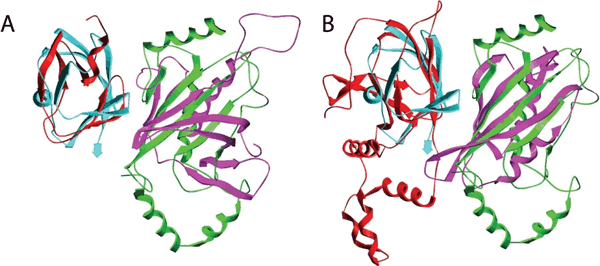 Figure 4: Protein-protein interaction prediction (PREPPI) using remote structural homology. A single template complex involving ubiquitin (cyan in panels A and B) and ubiquitin-conjugating E2D3 (green in panels A and B) forms the basis of our prediction of two distinct PPIs. A: Interaction between protein kinase C epsilon (PKCε, red in panel A) and serine/threonine-protein kinase D1 (PKD1, purple in panel A). B: Interaction between the von Hippel–Lindau tumor suppressor (VHL, red in panel B) and elongation factor 1-delta (EF1δ, purple in panel B). In both cases there is no sequence relationship between the target and the template proteins. The red structure in panel A and the two purple structures are homology models.