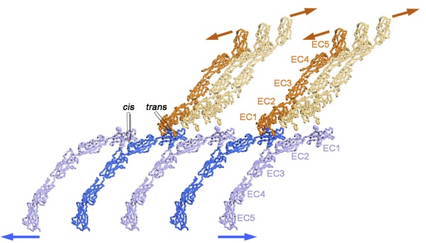 Figure 2: Two-dimensional layer seen in cadherin crystal structures reveals atomic-level structure of adherens junctions. The five extracellular cadherin (EC) domains are indicated. The blue and orange layers are shown as protruding between apposed surfaces and bind through the trans(molecules from different surfaces) interface mediated by the swapping of N-terminal β-strands between partner EC1 domains. For clarity, trans interfaces are shown only for the darker-colored molecules, and only a few rows of molecules are shown. The two-dimensional (2D) crystal lattice is formed through both trans and cis (molecules on the same surface) interactions as indicated, producing two linear arrays oriented in nearly perpendiculardirections (arrows) that together produce a 2D layer.
