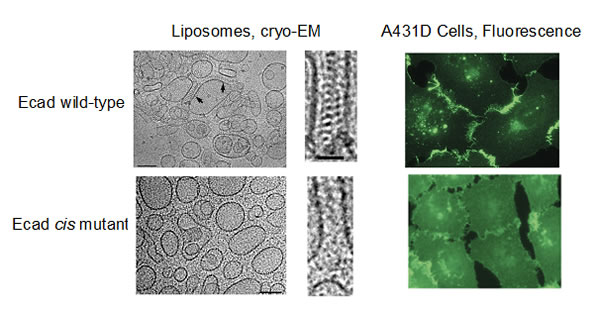 Figure 3: Weakening lateral cis interactions disrupts junction formation in liposomes and in transfected cell lines. Left panel: Ordered junctions form between liposomes coated with E-cadherin (Ecad), but aggregation in the liposome-liposome interface is diminished in cis mutants. Right panel: Fluorescently labeled wild-type E-cadherins accumulate at cell-cell interfaces in transfected cell lines but are dispersed throughout the cell surface following transfection with cis mutants.