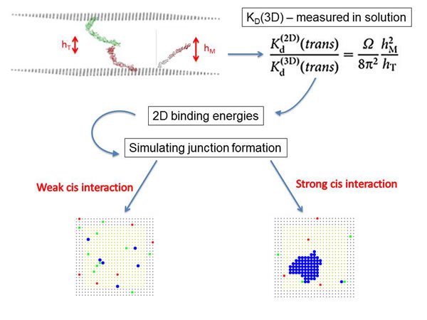 Figure 1: Theoretical/computational approach to calculate two-dimensional (2D) dissociation constants, Kd(2D), from solution measurements, Kd(3D). The equation (upper right) relates 3D to 2D dissociation constants for the trans binding of receptors located on apposed membranes. hMdenotes the range of motion of the EC1 domain (Figure 2) in the monomer (M) hT denotes the range of motion of the EC1 domain in the trans dimer (T). Ω denotes the allowable range of rotational motion of the entire ectodomain when it is attached to the membrane. These three variables are obtained from multiscale simulations that combine atomistic molecular dynamics simulations and coarser-grained simulations where each domain is treated as a rigid object (upper left). The theoretical expression yields Kd(2D), which is transformed into a binding free energy. The calculated trans- and cis-binding free energies are then used in lattice simulations of junction formation (lower left and right). Red and green dots indicate cadherin monomers on apposed cell surfaces, blue dots designate trans dimers, and light yellow denotes the cell-cell contact region. The formation of a blue cluster (lower right) indicates that, when cisinteractions have been strengthened by trans dimerization, a junction has been formed. Whencis interactions are weak, as in our cis mutants, only a few trans dimers are formed (lower left), even though the trans interactions are identical in both cases.