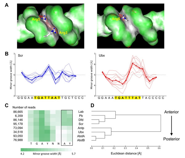 Figure 5: Minor groove shape profiles correlate with Hox protein specificity. A: Surface representation of the minor groove region that binds to the N-terminal arm of the Scr (left) and Ubx (right) homeodomains. Surfaces are obtained from crystal structures of Exd-Scr and Exd-Ubx bound to DNA containing the core motif of both proteins. Scr has two narrow sites where Arg3 and Arg5 bind, while Ubx has only a single narrow region where Arg5 binds. The enhanced electrostatic potential in each narrow region is indicated with a red mesh. B: Predicted minor groove width obtained from Monte Carlo simulations plotted along the strongest binding nucleotide sequence for Scr (left) and Ubx (right). Profiles for the 10 strongest binding sequences are shown (bold lines are the averages of the 10). The core motif is highlighted in yellow. C: Heat map characterizing the average minor groove width of all sequences above a relative binding affinity threshold of 0.1 for each Exd-Hox heterodimer. Dark green represents narrow minor groove regions, and white denotes wider minor grooves. D: Dendrogram obtained from clustering of Euclidean distances between average minor groove width of the TGAYNNAY core.