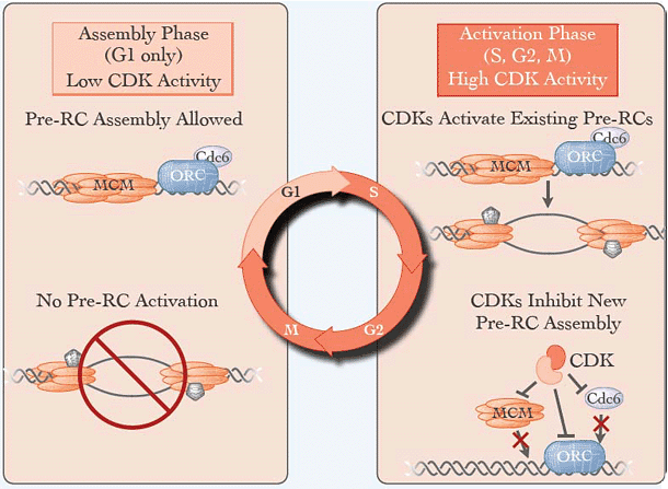 As cells enter the G1 phase of the cell cycle, chromatin-associated ORC recruits two other replication factors (Cdc6 and Cdt1) and the eukaryotic DNA helicase (the Mcm2-7 complex) to the origin DNA. In a coordinated series of events, ORC, Cdc6 and Cdt1 act to load multiple DNA helicases onto the adjacent DNA, forming pre-replicative complexes (pre-RCs). Formation of the pre-RC is required to license each potential origin for initiation of replication in the subsequent S phase and is tightly restricted to the G1 phase of the cell cycle (Figure 1).