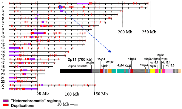 As a complement to our understanding of human variation, we focus on understanding natural genomic variation between humans and other primates. Because of the limitations of assembled genome sequence, we employ computational tools we developed during the analysis of the human genome to characterize lineage-specific and shared duplications between humans and great apes. In addition to genome-wide analyses, targeted high-quality sequencing of specific regions will provide long-range continuity to model evolutionary processes within these regions. There are two objectives. We will reconstruct the evolutionary history of every recent (<40 million years) segmental duplication within the human genome. In collaboration with Pavel Pevzner (University of California, San Diego), we are developing computational methods to identify ancestral states based on outgroup genomic data and to extract historical associations by application of graph theory, which promises to deconvolute the subrepeat structure of mosaic duplications. Using comparative sequence from these regions, we are also modeling the frequency of gene conversion and its impact on the structure of these regions.