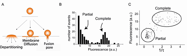 Richard Tsien's laboratory (Stanford University) discovered that in hippocampal neurons, synaptic vesicles loaded with FM dye sometimes release only a fraction of their dye—a finding that is consistent with kiss-and-run exocytosis. We also observed these phenomena and have quantified the proportion of partial dye-release events. Surprisingly, two-thirds of all events appear to be partial release events, with the balance of events involving complete release of the dye. By examining the rate of dye release, we found that complete release events can be explained by full fusion of the synaptic vesicle membrane with the plasma membrane. Partial release events, however, are very different; the kinetics of dye loss during partial release events are too slow to allow lateral diffusion of the dye into the plasma membrane. These findings suggest the predominant mode of exocytosis in hippocampal neurons does not permit lipid mixing but rather is mediated by a fixed fusion pore with a relatively small diameter.
