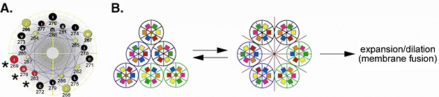 In a series of collaborative projects with Meyer Jackson's laboratory (University of Wisconsin–Madison), we are testing the idea that the transmembrane domains of SNARE proteins transiently line the fusion pore during secretion from neuroendocrine cells. Systematic substitutions of residues in the transmembrane domain of syntaxin revealed that three amino acids that lie along one face of this domain (when arranged into an α-helix) influence transmitter flux through the pore. There is a linear relationship between transmitter flux and the volume of the amino acid side chain placed in these three positions, but not in other positions, in the transmembrane domain. We are testing the idea that the transmembrane domains of synaptobrevin, in the vesicle membrane, form the other half of a fusion pore hemichannel.
