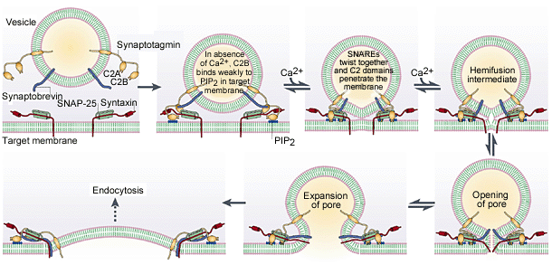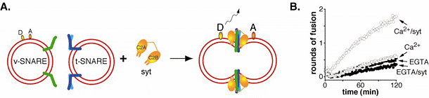 James Rothman's laboratory (Columbia University) has shown that three proteins (termed SNAREs)—synaptobrevin on the vesicle membrane and SNAP-25 and syntaxin on the target membrane—directly mediate membrane fusion in vitro. We have extended these findings and shown that in the presence of another protein, synaptotagmin (syt) I, SNARE-catalyzed membrane fusion is regulated by Ca2+. Thus, syt and SNARE proteins are the minimum protein complement for Ca2+-triggered membrane fusion in vitro. We are optimizing the minimal fusion machine, by adding back additional proteins and lipids, to make it operate on the millisecond timescale. We have combined this approach with biophysical and optical methods to monitor protein-protein and protein-lipid interactions during fusion and to resolve intermediates during the fusion reaction. These experiments are making it possible to understand the molecular rearrangements that underlie hemifusion, fusion pore opening, and complete bilayer merger.