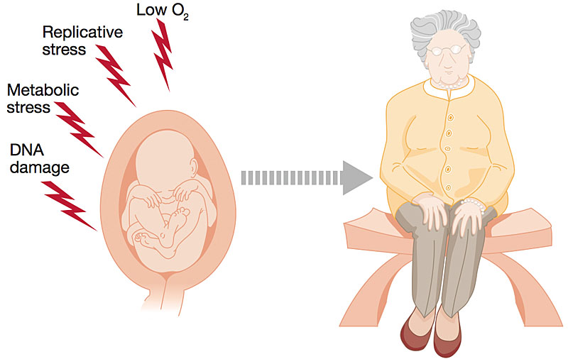 In contrast to the numerous studies on the ATM- and Chk2-dependent DDR, understanding of the RSR was clearly lagging behind. Again, the essential nature of ATR/Chk1 had severely limited the field. However, at about the same time I was opening my independent laboratory in 2005, two groups reported that cancer-associated mutations could generate RS, suggesting that it could be at the very root of cancer development. Thus, I began by trying to develop tools to study RS in mammals that could overcome the problem of lethality. First, we generated a cell system in which we could activate ATR at will, in a controlled manner, and in the absence of RS. This model has become a robust platform for identifying chemicals and genes that modify ATR activity. At the same time, we generated a mouse model of Seckel syndrome, which was based on a mutation that severely decreases ATR levels. ATR Seckel mice are severely hypomorphic for ATR but alive and amenable to genetic crosses. However, Seckel mice accumulate significant amounts of RS and succumb to a progeroid syndrome. Interestingly, most of the RS found in these animals was restricted to the embryonic period and was marginal after birth. Hence, we had a case of intrauterine stress apparently accelerating aging later in life. This research led me to propose the concept of "intrauterine programming of aging"—namely, that intrauterine stress can influence aging later in life (Figure 1). Surprisingly, the aging observed in ATR Seckel mice was further aggravated by the absence of p53; this instance was the first time p53 loss was shown to promote aging.