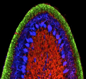 We have found that the primary cilium, an immotile appendage found on most cells, serves as an antenna for receiving the Sonic hedgehog (Shh) signal. The transduction machinery of the pathway is contained within such cilia. We have shown that Shh and Ptc control movements of proteins into or out of the cilia as they influence expression of genes. We are investigating the mechanisms through which cilium proteins affect Shh signaling in development and cancer.