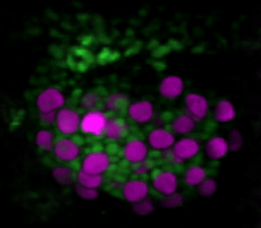 Figure 1: RNA localization during germ cell formation. The image shows the posterior pole of an embryo. Microtubules (red), DNA (blue), and nanos RNA (green).