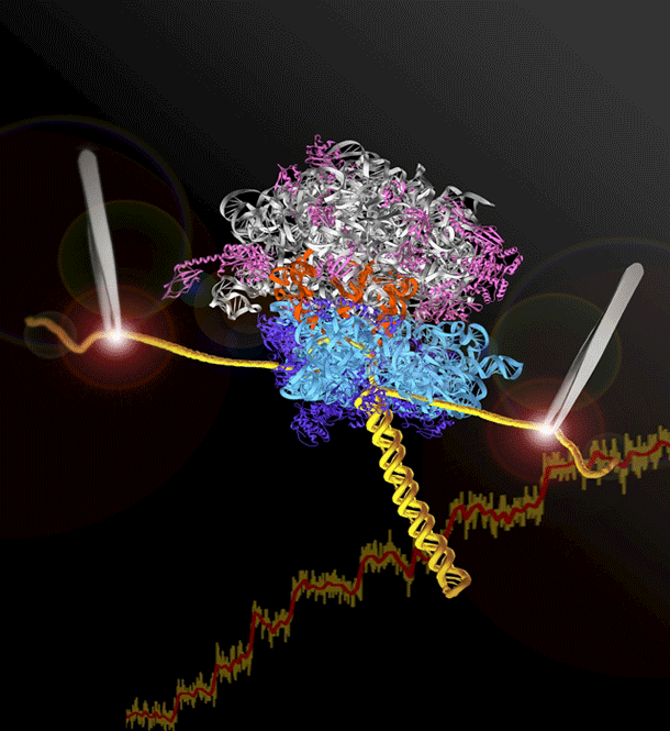 In collaboration with Ignacio Tinoco Jr. (University of California, Berkeley), we are using a single-ribosome/single-mRNA helicase-based assay to characterize the dynamics of translation by single Escherichia coli ribosomes (see Figure 6). In these experiments, we follow individual ribosomes as they translate single messenger RNA hairpins tethered by the ends to optical tweezers. These studies have revealed that translation occurs through successive translocation-and-pause cycles (see Figure 7). The distribution of pause lengths, with a median of 2.8 seconds, indicates that at least two rate-determining processes control each pause. Each translocation step occurs in less than 0.1 seconds and measures three basesone codonindicating that translocation and RNA unwinding (i.e., the helicase activity of ribosomes) are strictly coupled ribosomal functions. Pause lengths, and therefore the overall rate of translation, depend on the secondary structure of the mRNA; force applied to the hairpin destabilizes its secondary structure and decreases pause durations but does not affect the translocation times.