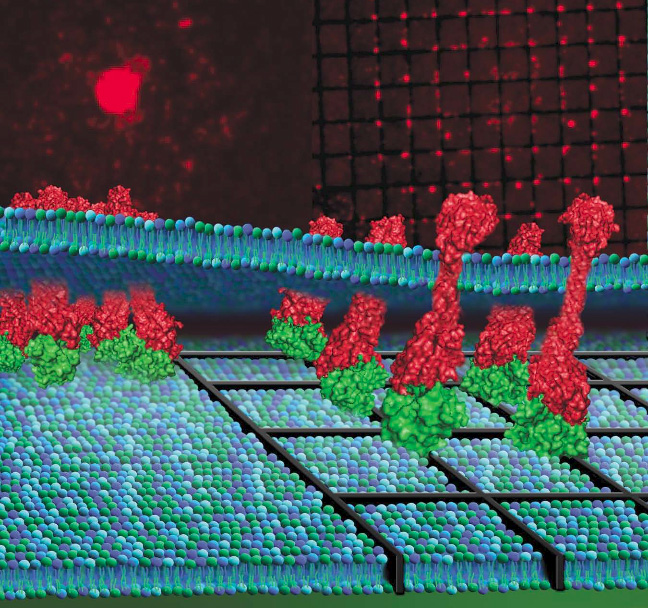 When the supported membrane is patterned into a grid array of isolated corrals, an additional layer of control is achieved. Since barriers block lateral transport, the molecular content of any given corral is fixed. Thus, when a cell assembles a signaling cluster, the ligand content of that cluster is now limited by the corral contents. The cell is no longer able to scavenge ligands from a wide area. This relatively simple constraint provides a powerful analytical tool with which we can probe the precise role of cluster assembly on signaling functionality.