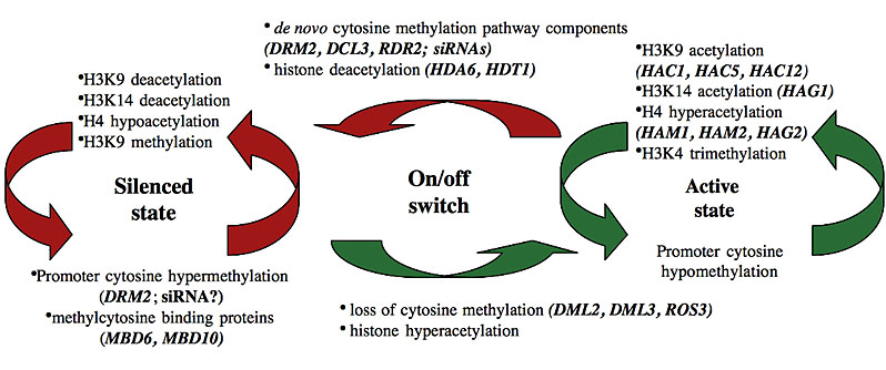 The second major focus of my laboratory is nuclear dominance, an epigenetic phenomenon that occurs in genetic hybrids and describes the preferential transcription of rRNA genes inherited from only one of the two parents. For many years, it was thought that the basis for nucleolar dominance was the preferential activation of one set of rRNA genes due to their (hypothetical) higher binding affinity for one or more limiting transcription factors. However, we showed instead that the molecular basis for nuclear dominance is the preferential silencing of one set of rRNA genes via a mechanism that includes repressive chromatin modifications, including cytosine methylation and a series of repressive histone modifications. Using genetic approaches, we have identified many of the players required for the preferential silencing of rRNA genes in nucleolar dominance, including specific DNA methyltransferases, methylcytosine-binding domain proteins, histone deacetylases, and histone methyltransferases (Figure 2).