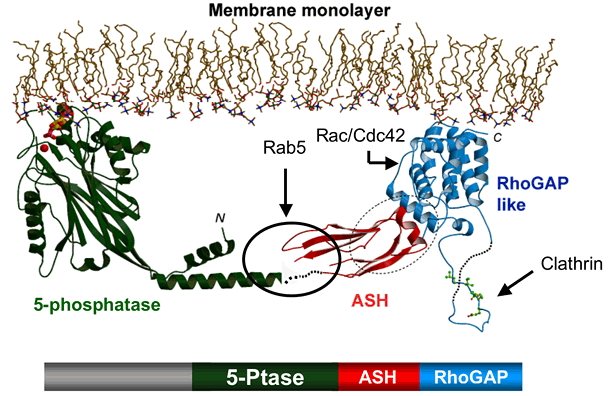 An important focus of our research in this area continues to be the role of enzymes that dephosphorylate PI(4,5)P2, such as synaptojanin, the major inositol 5-phosphatase at synapses, and other inositol 5-phosphatases, such as OCRL. OCRL mutations are responsible for the oculocerebrorenal syndrome of Lowe, a rare but severe human condition, so named because of the developmental delay, kidney defects, and congenital cataract observed in affected patients. Our studies of OCRL demonstrated that a main function of this enzyme is to prevent PI(4,5)P2 accumulation on endosomes, so that its absence results in major perturbation of their sorting function. Ongoing studies address the link between such perturbations and the clinical manifestations resulting from OCRL mutations.