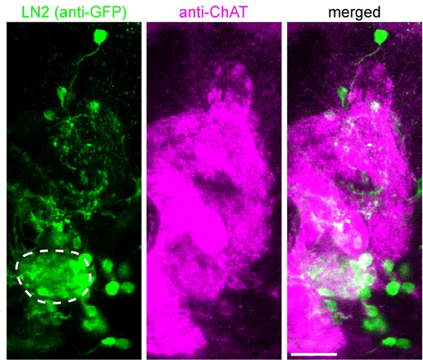 Our recent work has shown that the insect odorant receptor is a heteromeric complex of the Or83b coreceptor with a conventional ligand-binding odorant receptor. Or83b is necessary and sufficient to target this OR/Or83b complex to the ciliated dendrite of the olfactory sensory neuron. In collaboration with Kazushige Touhara and colleagues (University of Tokyo), we investigated whether Or83b has signaling functions beyond its role in ciliary trafficking. Our recent work provides strong evidence that the OR/Or83b complex forms an odor-gated nonselective cation channel that does not depend on G protein signaling. We are carrying out a large-scale in vivo structure-function analysis of Or83b and the conventional odorant receptors to probe the biology of these unusual membrane receptors. Our goal is to map those domains that are necessary for the heteromeric association of the OR/Or83b complex, domains necessary for trafficking, and residues that are necessary for odor signal transduction. We are particularly interested in discovering which residues may contribute to forming the ion-conducting pore. Going beyond conventional genetics, we are using chemical biology to probe for small molecules that interfere with heterodimerization, trafficking, or signaling of OR/Or83b complexes. Some of these compounds may be useful elements in a chemical strategy to block olfactory host-seeking behaviors in mosquitoes and other pest insects. These compounds may act as insect repellents that could be useful to control insect vectors that transmit human infectious diseases.