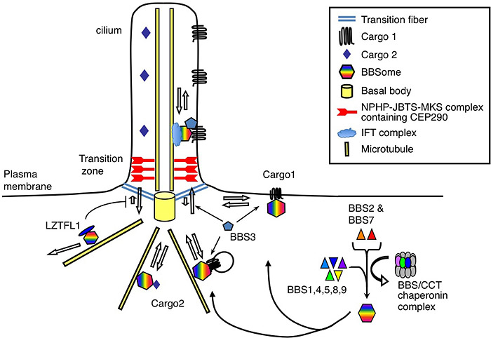 My laboratory has played a key role in elucidating the function of BBS proteins, as well as the identification and characterization of BBS protein complexes. We have traditionally used genetic approaches including genetic linkage mapping, positional cloning, and more recently, high throughput DNA sequencing to identify genes associated with human diseases. Recently, we have used tandem affinity purification and mass spectrometry-based proteomics as a technology to identify protein complexes. Our use of biochemical methods to identify novel protein complexes and proteins that interact with these complexes have aided in the identification of pathways involved in specific clinical features of BBS including obesity and hydrocephalus. The fact that the mutation of multiple different genes can independently cause BBS has now been largely explained by the discovery of two BBS protein complexes: the BBSome (consisting of seven BBS proteins), which plays a role in intraflagellar transport; and a chaperone complex (consisting of three BBS proteins), which is required for BBSome assembly (Figure 2).