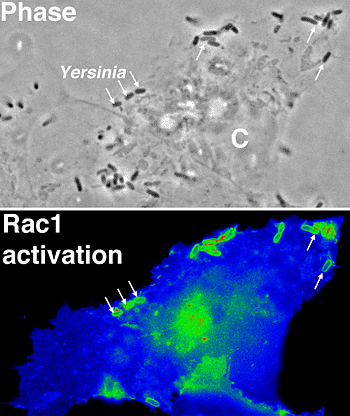 The cell-binding region of invasin recognizes at least five different receptors. Called integrins, these proteins had been previously identified by investigators interested in a variety of mammalian cell-adhesion processes, such as immobilizing cells to the matrix that supports them. Several mammalian signaling proteins in addition to integrins are required for bacterial uptake. Much of our recent work has been devoted to understanding how the bacterium manipulates these signaling proteins, because bacterial alteration of these proteins is critical for allowing uptake into cells during the initial disease process and for ensuring that the bacterium is outside cells at later times during disease. One such signaling protein is Rac1, which controls the cytoskeleton, a cell structure that is necessary for bacterial uptake. We used fluorescence resonance energy transfer (FRET) to show that shortly after the bacteria bind the target cell, the Rac1 protein is recruited to the site of bacterial binding and undergoes a conformational shape change that activates the protein and is necessary for bacterial uptake. As the infection proceeds, there appears to be a complex interplay between invasin and other Yersinia proteins, called Yops, that results in either inactivation of Rac1 or a change in the intracellular locale of Rac1. Our current work is devoted to determining how these potentially antagonistic proteins collaborate to promote disease.
