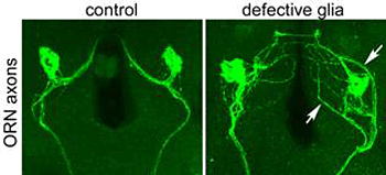 It is widely believed that glial cells play an important role in wiring the nervous system, but compelling evidence supporting a requirement for glia in the establishment of neural connectivity has remained scarce. We are exploring the mechanisms by which glia sculpt neural connectivity during development in two contexts: the adult Drosophila antennal lobe, and the larval neuromuscular junction (NMJ). Through glial-specific knockdown of a number of signaling molecules we have found that developing adult brain glia are critical players in the wiring of the adult olfactory system (Figure 2). This observation implicates glia in establishment of the precise spatial map of olfactory receptor neuron (ORN) axon connectivity in the antennal lobe. We are now seeking to determine how neuron-glia interactions sculpt axonal connections in this tissue.