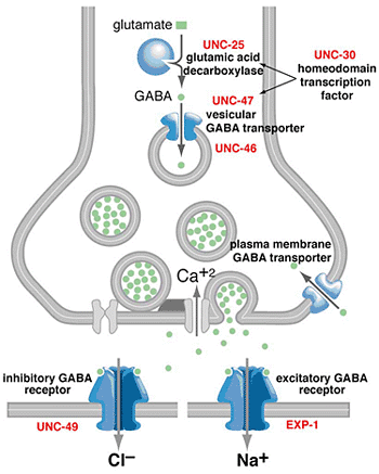 Our first goal was to identify genes required specifically for GABA function. GABA is the primary inhibitory neurotransmitter in vertebrate and invertebrate nervous systems. We identified the genes required uniquely for GABA transmission in the worm and then sought their homologs in vertebrate genomes. Pioneering work by Steve McIntire in the laboratory of H. Robert Horvitz demonstrated that 26 of the worm's 302 neurons synthesize GABA (Figure 1). We then used a laser to kill the GABA neurons in wild-type animals and identified four behaviors mediated by GABA neurons.