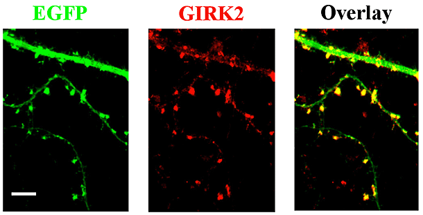 Figure 3: GIRK2 in dendritic spines of hippocampal neurons. The GIRK2 (Kir3.2) channel protein (red immunofluorescence) resides in dendritic spines as well as shafts of hippocampal neurons expressing enhanced green fluorescence protein (EGFP), in culture for 4 weeks. Scale bar, 10mm. The presence of the machinery for slow synaptic inhibition in dendritic spines, home for the signaling pathway for long-term potentiation of fast excitation, prompted the study showing that the same signaling pathway also induces long-term potentiation of slow synaptic inhibition mediated by GABAB receptors and GIRK channels.