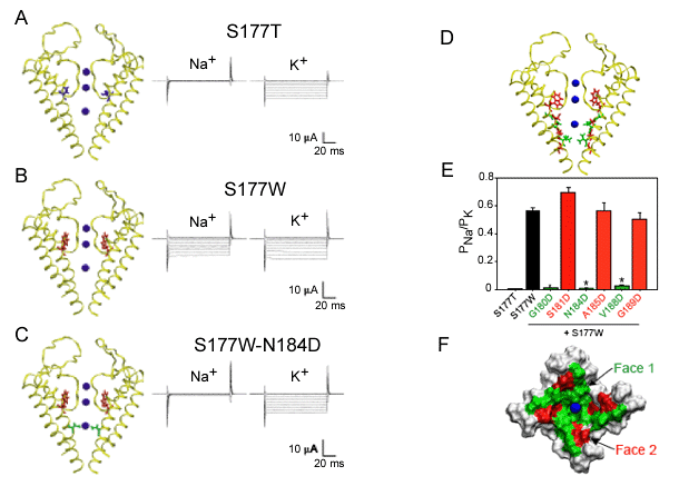 E: Aspartate substitution of residues on face 1 (green) but not on face 2 (red) restores K+selectivity, as shown by the ratio of Na+ permeability and K+ permeability deduced from the difference in reversal potential measured in 90-mM Na+ or 90-mM K+ solution. *p < 0.001.