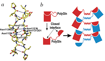 b, Speculative three-dimensional domain-swapping, polar-zipper model for formation of aggregates, with polyamide expansion loops. With the expansion of polyglutamine (PolyGln) in the hinge loop between two domains, a fluctuation that breaks the noncovalent bonds between the two domains exposes the polyglutamine loop as well as the two halves of the closed interface. The polyamide segment is able to form a b sheet, with three hydrogen bonds per residue pair, as observed for residue 113 in a. This stabilized sheet grows as additional polyamide b strands are added, defining the fiber axis perpendicular to the b strands, shown at the right. The sheet may be further stabilized by three-dimensional domain swapping formed by additional closed interfaces at the two sides of the sheet. A less-stable sheet could be formed by other (nonpolyamide) sequences and could account for the observation that proteins that undergo transition to the amyloid state exhibit enhanced b structure.