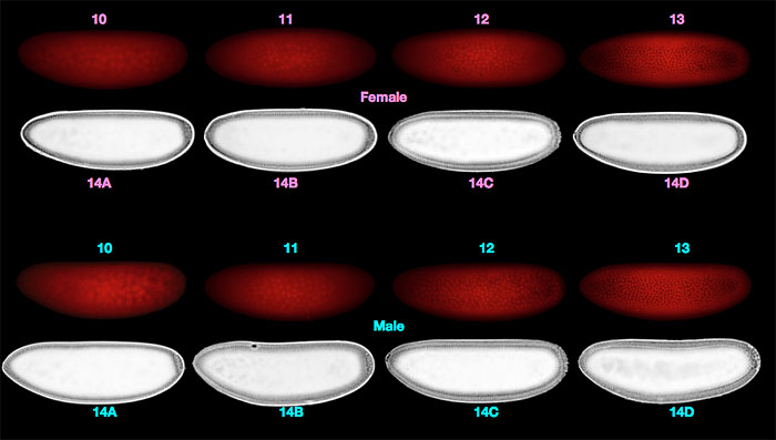 Because many of the genes involved in these processes are on the X chromosome, we wondered whether they are transcribed at higher levels in females and whether this might lead to sex-specific early embryonic patterning. To investigate this possibility, we developed methods to precisely stage, sex, and characterize the transcriptomes of individual embryos. We measured genome-wide mRNA abundance in male and female embryos at eight timepoints, spanning mitotic cycle 10 through late cycle 14 (see Figure) using polymorphisms between parental lines to distinguish maternal and zygotic transcription. We found limited sex-specific zygotic transcription, with a weak tendency for genes on the X chromosome to be expressed at higher levels in females. However, transcripts derived from the single X chromosome in males were more abundant that those derived from either X chromosome in females, demonstrating that there is widespread dosage compensation before the activation of the canonicalDrosophila dosage compensation system, which results in hypertranscription of the single male X.