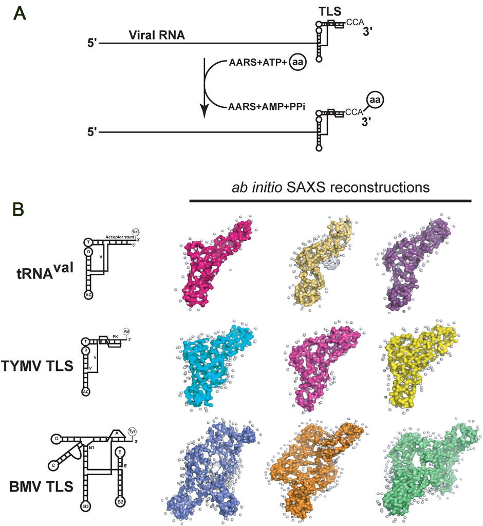 Certain economically important plant-infecting RNA virus genomes become aminoacylated at their 3' ends by the host cell's aminoacyl-tRNA synthetases (AARSs) (Figure 3). This reaction depends on RNA sequences, called tRNA-like structures (TLSs), that reside at the 3' end of the genome and that can have sequences and secondary/tertiary structures that differ substantially from authentic tRNAs. TLSs interact with AARSs and other proteins to include the viral RNA-dependent RNA polymerases (RDRPs). It has been proposed that TLSs regulate several steps in the viral replication cycle. This raises two questions: What are the three-dimensional structures and structural dynamics that allow this multifunctionality? How are structurally divergent TLSs able to recruit and manipulate the host cells AARSs? Using biophysical methods such as small-angle x-ray scattering combined with biochemical assays and x-ray crystallography, we are seeking a deeper understanding of these virally encoded molecular mimics, with the long-term goal of understanding how viral RNAs manipulate the cellular machinery (Figure 3).