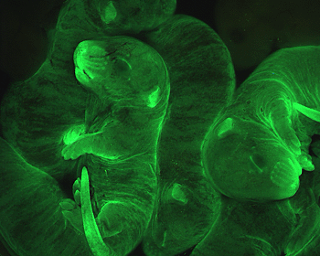 Figure 10: Mice expressing a green fluorescently tagged actin protein in the skin. These mice are used to understand how actin-based movements play a role in wound healing and in cancer.