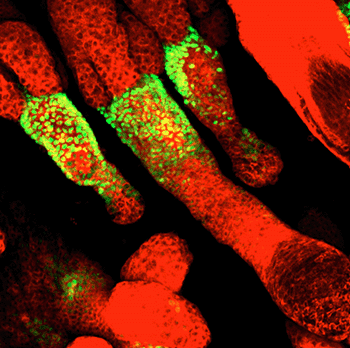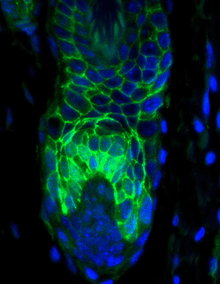Figure 8: Fluorescent labeling of stem cells in skin. In adult skin, each hair follicle possesses a reservoir of stem cells. On the premise that most adult stem cells are used sparingly and consequently divide only infrequently, the Fuchs lab developed a method to label stem cells specifically. Thus, if a green fluorescent histone is first expressed in all the epithelial cells of the skin, but then its expression is turned off, the more rapidly dividing progeny dilute out the label, and only the stem cells retain it. The fluorescent red labels the membrane boundaries of the hair follicle cells.