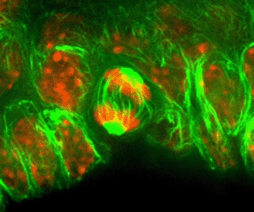 Figure 7: Controlling the balance between growth and differentiation by asymmetric divisions. As embryonic epidermis begins to stratify, epidermal cells reorient their cell divisions, from parallel to perpendicular relative to the skin surface. As a consequence, one daughter cell remains in the proliferative layer, next to the underlying basement membrane, rich in extracellular matrix and growth factors, while the other daughter is placed in the suprabasal layer, where it differentiates and makes the protective seal on the body surface. Embryonic day 15.5 skin was stained with an anti-tubulin antibody (green) and with propidium iodide (red).