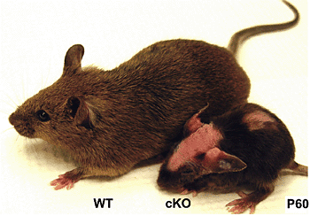 Figure 6: Uncontrolled release of cytokines. Without p120-catenin, epidermal cells cannot dampen the activity of NFκB, which controls expression of a number of proinflammatory cytokines. Epidermal release of cytokines is necessary in a normal wound response to fight off infection. When uncontrolled, it leads to a vicious proinflammatory response, resulting in hyperproliferation of the skin and thinning/loss of hair. WT, wild-type mouse; cKO, mouse lacking p120-catenin in the skin epithelial cells. Mice were photographed at 60 days of age.