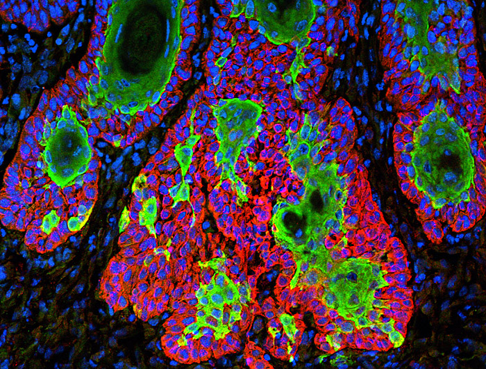 Figure 2: Squamous cell carcinomas of the skin contain undifferentiated stem cells, which reside within the tumor-stroma interface. These cancer stem cells sustain long-term tumor growth and also differentiate into keratinized pearls at the tumor center. Here, keratin 5 (red) marks both undifferentiated cancer stem cells and their early progeny, while keratin 6 (green) is a well-established feature of aberrant tumor differentiation. Nuclear DNA is detected by DAPI (blue).