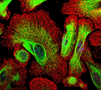 Figure 12: Primary mouse keratinocytes grown under conditions that limit cell-cell adhesion. Confocal microscopy of cells labeled with antibodies against keratin 5 (green), DAPI (blue), and ACF7 (red). ACF7, an ortholog of the fly kakapo protein, is an unusual plakin that displays most prominent association with the peripheral ends of microtubules. It also binds to actin filaments but shows little or no association with the keratin cytoskeleton.