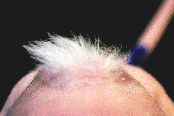 Figure 9: Generation of hair follicles, sebaceous glands, and epidermis in nude mice. Progeny from a single skin stem cell can generate hair follicles, sebaceous glands, and epidermis in nude mice. To monitor skin stem cells, the Fuchs lab engineered a mouse that enabled them to fluorescently label the infrequently dividing stem cells. They used a fluorescence-activated cell sorter to isolate the stem cells, which they then placed in culture. Each stem cell produced a large colony of cells in vitro, which they then grafted onto the back of a nude mouse (defective in making hair follicles). The hairs (fluorescent under the appropriate lighting) growing on this mouse are particularly remarkable in that they are descendents of a single stem cell.