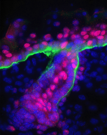 Figure 4: Embryonic mouse skin labeled with antibodies. Immunofluorescence image of embryonic mouse skin labeled with antibodies against Hes1, a nuclear factor encoded by a target gene activated by canonical Notch signaling (red). Skin sections are counterstained with DAPI (blue) to mark chromatin and with antibodies against β4 integrin (green) to mark the base of the epidermis.