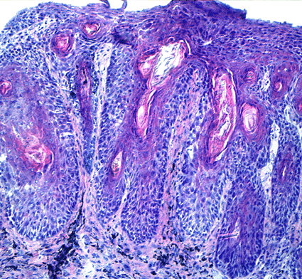 Figure 5: Skin epithelium lacking the cell-cell adhesion protein α-catenin was grafted onto the back of a Nude (hairless) mouse. Forty days later, the skin showed signs of squamous cell carcinoma (shown). By 70 days, the tumor had become invasive.