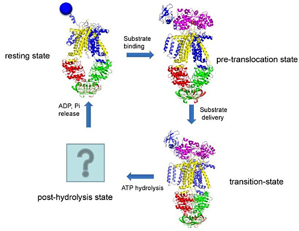 We use the maltose transporter (MalFGK2) from Escherichia coli as a model system to understand ABC importers. To construct the transport cycle, we determined the crystal structures of the maltose transporter in three distinct functional states. We obtained the inward-facing conformation, also known as the resting state, in which the transporter has very low ATPase activity, in the absence of maltose and nucleotides. The outward-facing conformation, corresponding to a catalytic intermediate in which ATP is poised for hydrolysis, was stabilized by the periplasmic maltose-binding protein and ATP. Finally, we captured a pretranslocation complex, which shows how substrates initiate the transport cycle, in the presence of the maltose-binding protein but in the absence of ATP. Then, to characterize the chemistry of ATP hydrolysis at an atomic level, we also determined crystal structures of the maltose transporter stabilized by ADP in conjunction with the phosphate analogues BeF3-, VO43-, and AlF4-at a resolution 2.2–2.4 Å. These phosphate analog structures mimic conformational states along the trajectory of ATP hydrolysis and demonstrate that ABC transporters catalyze ATP hydrolysis via a general base mechanism.