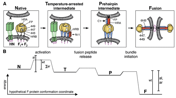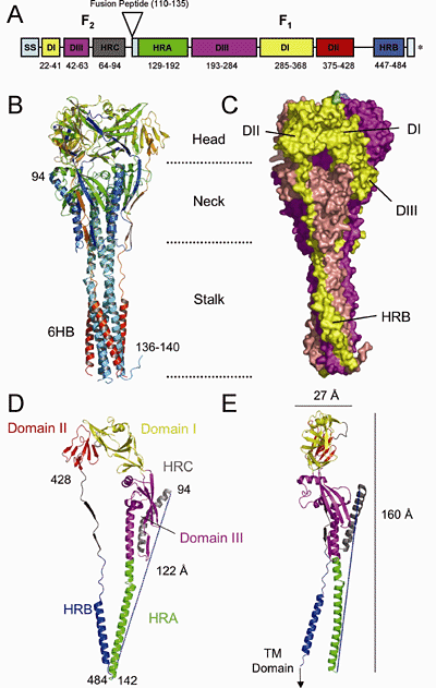 Figure 7: A model for F-mediated membrane fusion. A: Structure of the prefusion conformation. HRB, blue; HRA, green; domains I, II, and III are, respectively, yellow, red, and magenta.