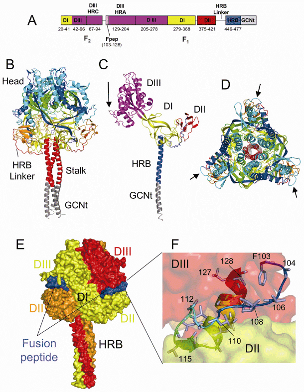 C: Ribbon diagram of one subunit of the F trimer colored by domain. The domains are labeled, and the colors correspond to those used in Figure 1A. The cleavage/activation site is indicated with an arrow.