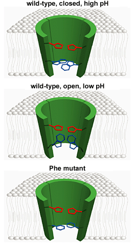 Lower panel, the M2-W41F mutant protein. In this case the smaller side chain of the Phe mutant permits passage through the pore regardless of pHout.