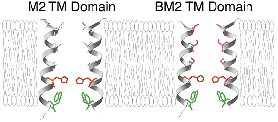 Figure 13: Schematic diagram indicating the conservation of the influenza B virus BM2 transmembrane (TM) domain His and Trp residues as compared to residues in the influenza A virus M2 proton-selective ion channel protein. Histidine residues are colored red, tryptophan residues are colored green, and in BM2 the serine residues are colored magenta.