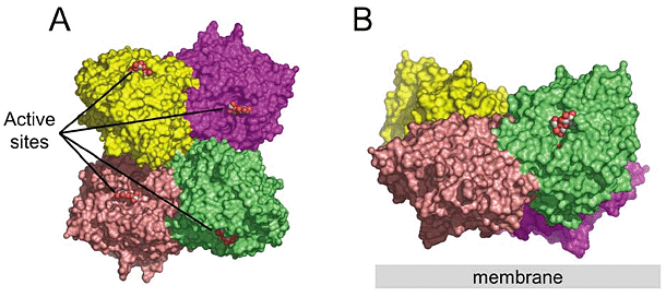 Figure 9: SV5 HN tetramers. Active sites are marked by space-filling representations of the ligand sialyllactose. The four subunits are shown in different colors. A: Top view. B: Side view.